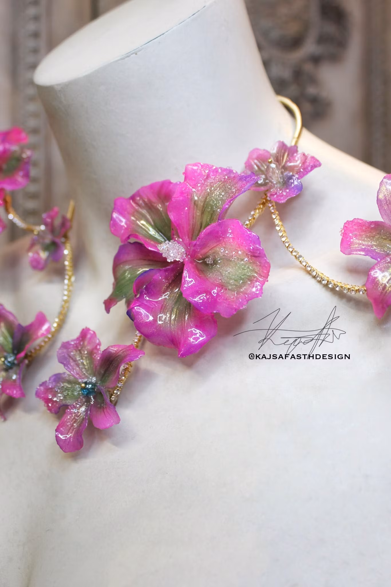 Blommornas pistiller är Swarovski och strass kristaller, dessa ger blommorna än mer sagolikt utseende.