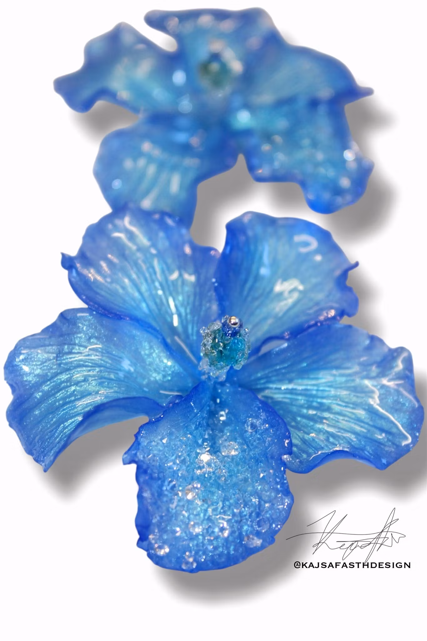 I mitten av hibiskus blomman sitter en kristalliserad glaskristall pistill, även utvalda blad på blommorna har fått 100 tals kristaller med både Cz & Strass applicerade.