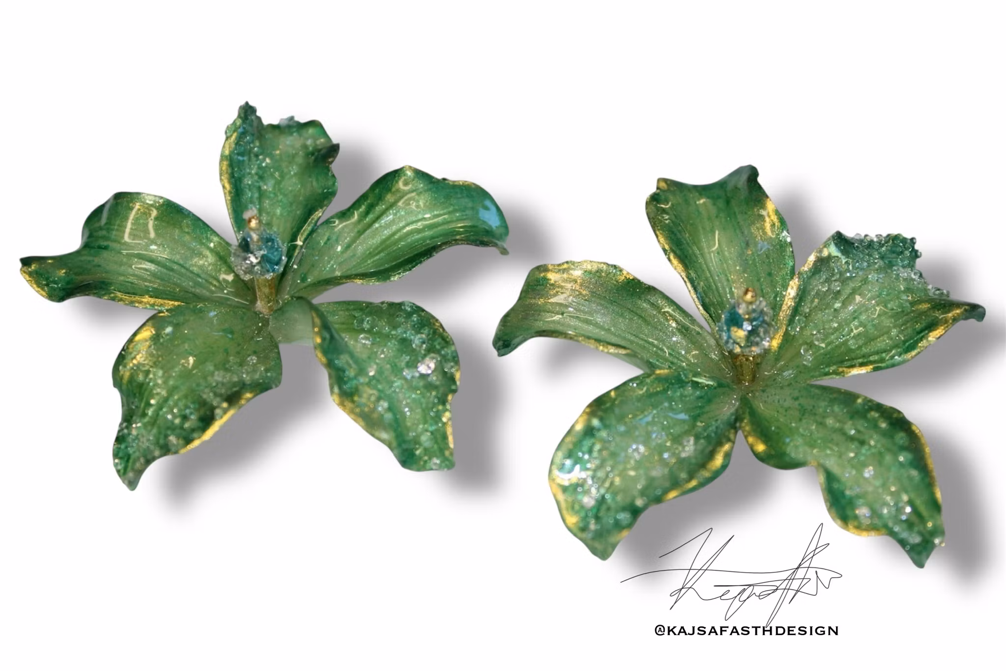 Namnet som betyder Blomma av ljus är ett passande namn på dessa fullt utslagna liljor, varje blad har sin egen form och design, färgerna är melerade i grönt med inslag av skimrande guld Du kan till och med se ådringarna i bladen vilket ger en äkta känsla av blomma fast från fantasins värld. Tre av bladen på båda örhängen har doppats i 100 tals gnistrande kristaller som mer eller mindre har blivit KFD signatur. I mitten på blomman har du en en vacker pistill där kristallen går i turkos och lätt grönt med massa kristaller.