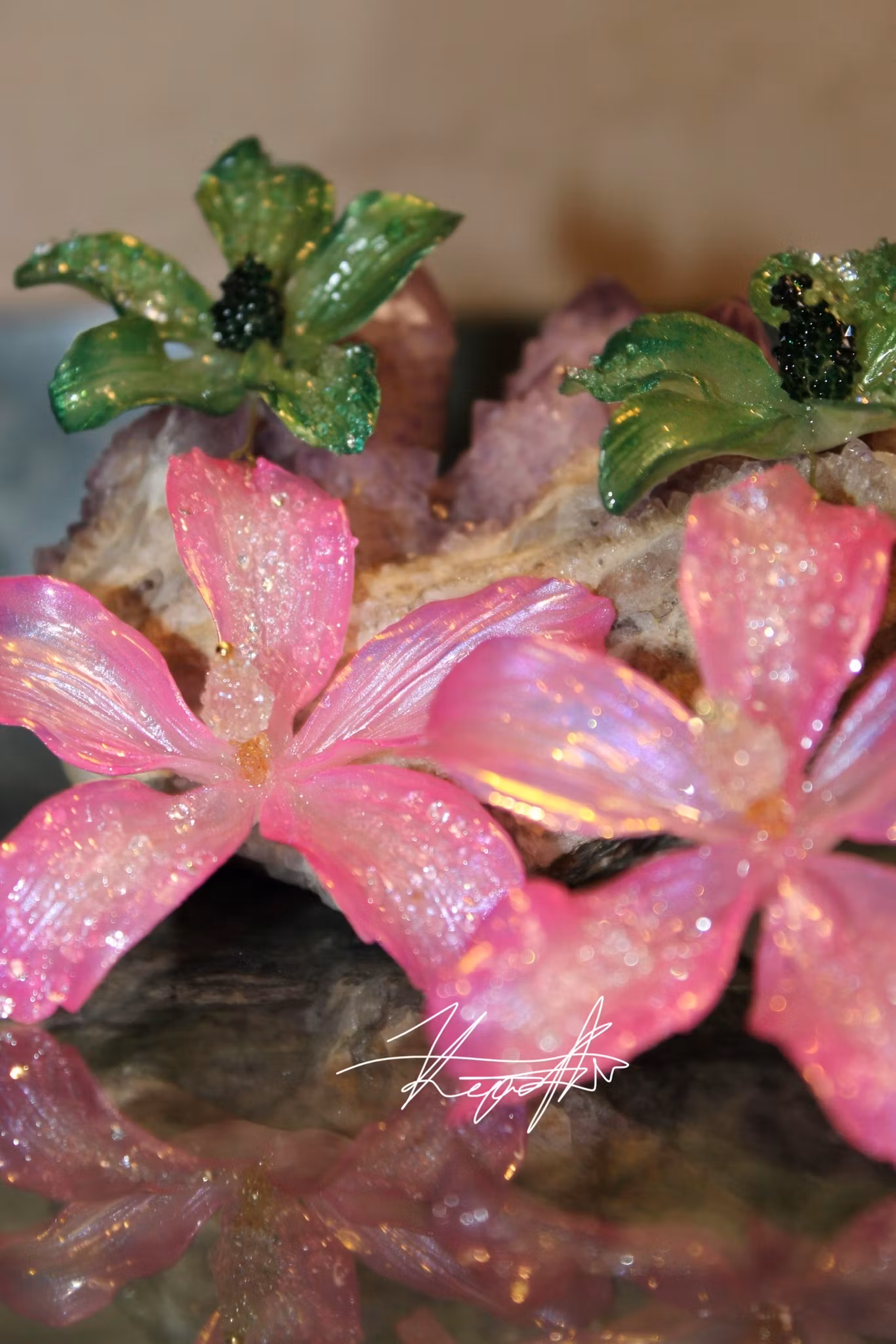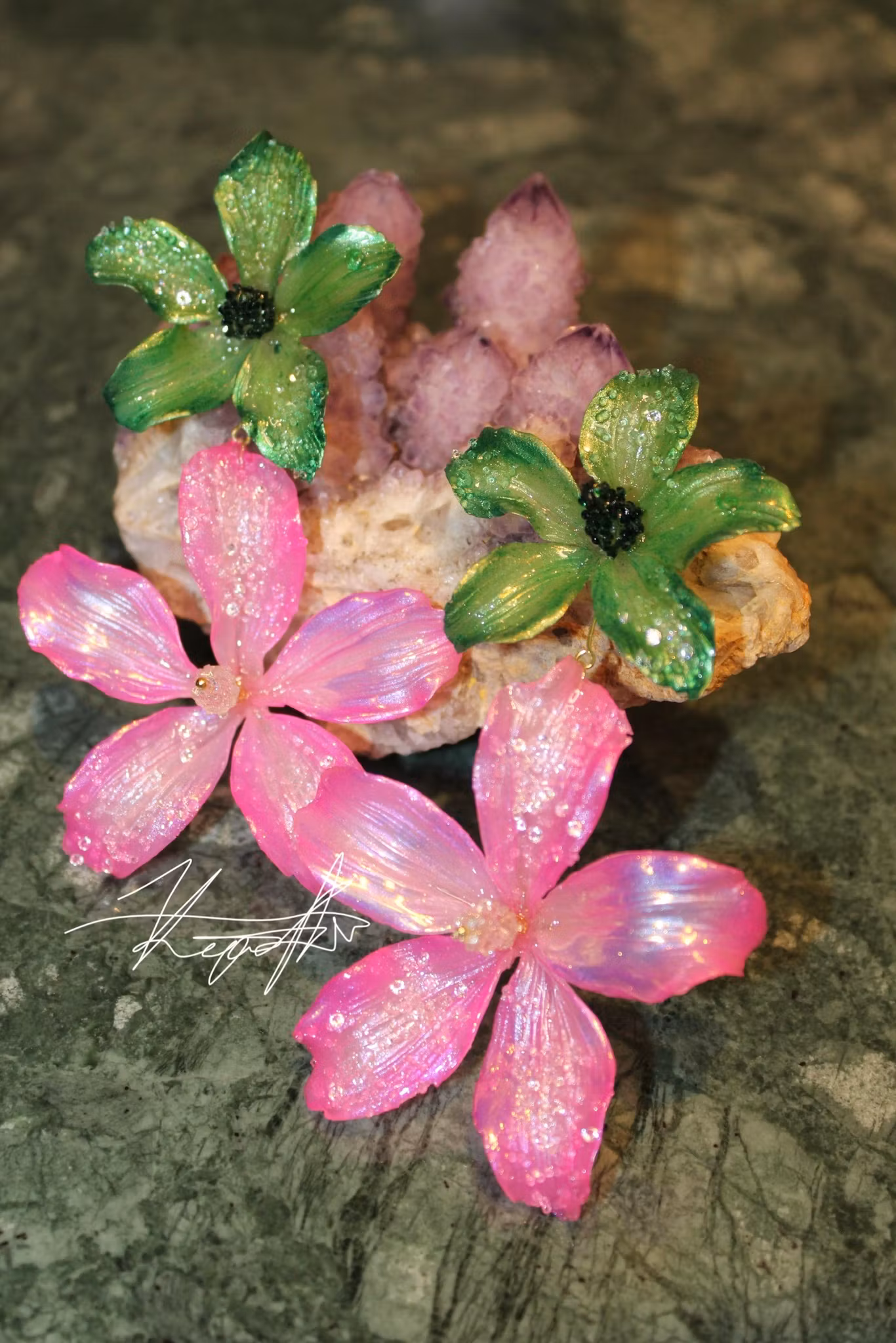 Jag använder mig av ett material som kallas polymerlera, vilket gör att smyckena är otroligt lätta att bära oavsett storlek. Effekterna som jag skapar gör jag genom att handmålade varje blad en efter en för att skapa djup & vackra effekter. Alla mina smycken är unika konstverk till just dig.